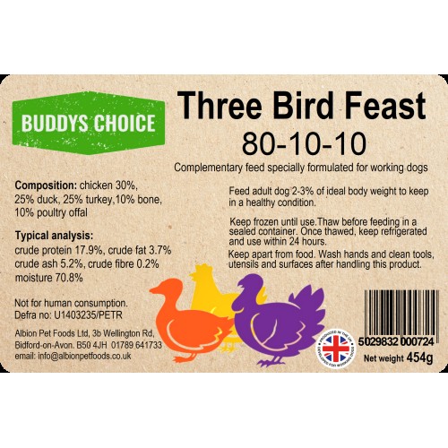 Buddyâs Choice Three Bird Feast is a premium, complementary raw food specially formulated for working dogs.