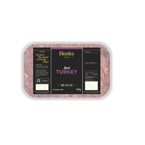 Just Turkey complete feed raw dog food. This is a complete feed containing 80% meat, 10% bone and 10% offal.