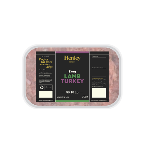 Lamb & Turkey complete feed raw dog food. This is a complete feed containing 80% meat, 10% bone and 10% offal.