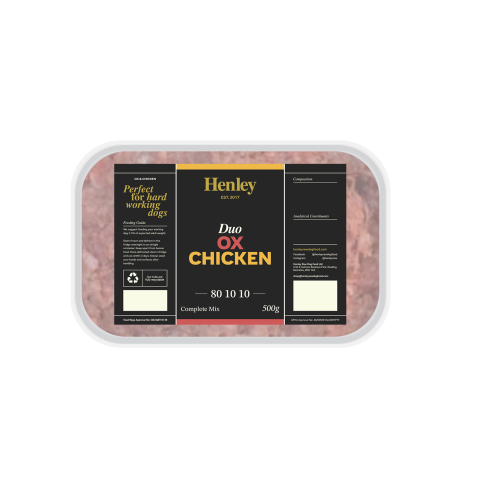 Ox and Chicken complete feed raw dog food. This is a complete feed containing 80% meat, 10% bone and 10% offal.