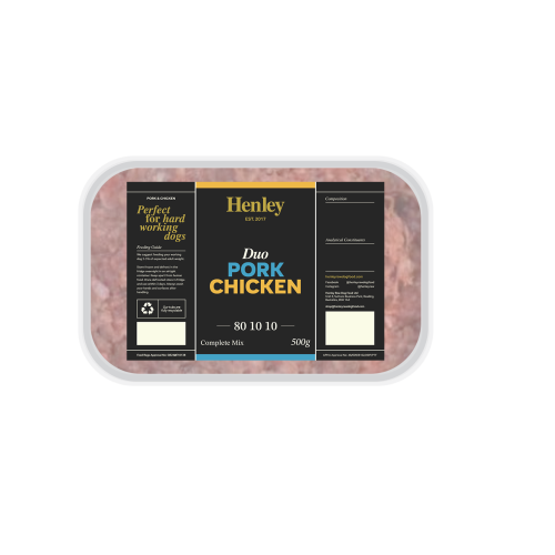 Pork and Chicken complete feed raw dog food. This is a complete feed containing 80% meat, 10% bone and 10% offal.
