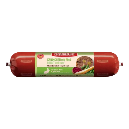 Composition: 38% Rabbit (meat, offal), 37% Beef (lung, hearts, kidney) 8.8% broth, 6.7% peas, potato, starch, minerals, 1.7% beetroot, egg shell meal, brewers yeast, 0.1% nettle, yucca root, 0.1% rapeseed oil.