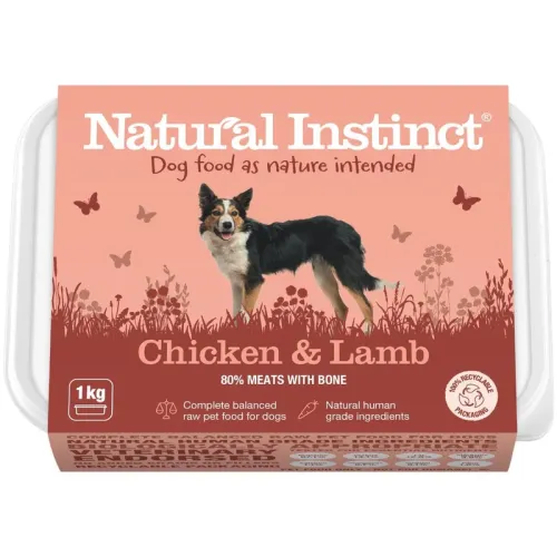 Natural Instinct's Natural Chicken & Lamb is a complete and balanced raw dog food with two protein sources. This mouth-watering recipe contains chicken meat with bone (50%), lamb offal (liver 5%), lamb heart (25%), vegetables and fruits. This frozen complete recipe is perfect for dogs who prefer a variety in their diets or perhaps find lamb alone too rich.