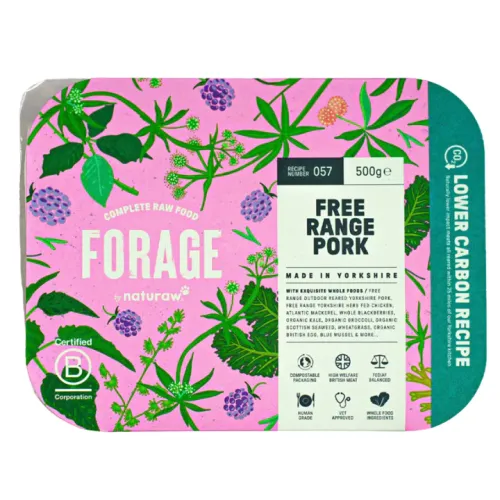Beautiful free range outdoor reared Yorkshire Pork from a farm just a few miles from our kitchen, and free range herb-fed Chicken – which is also raised a stones throw from Naturaw HQ. Combined with our exquisite Forage whole foods blend (including Organic vegetables that are often grown just 2 miles away). We’ve formulated this recipe as chicken & pork are naturally two of the lowest carbon producing meats, they are efficient at turning food into meat and require less water, energy & fertiliser. Coupled with the incredibly low food miles this results in this recipe being significantly lower in carbon on average than our other offerings.