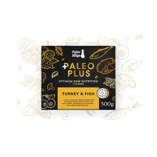 Paleo Plus Turkey & Fish is an expertly minced, lean and chunky raw dog food conveniently packaged in 100% recyclable 500g packs. This gourmet delight is made from high-welfare British turkey, premium beef offal and sustainably caught seasonal fish.
