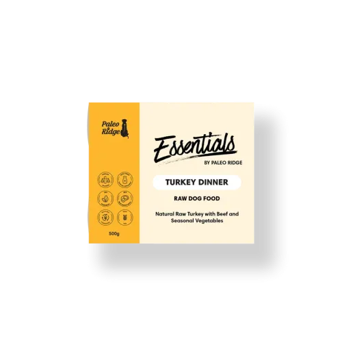 Essentials Turkey Dinner is a chunky, complete and balanced raw dog food, consisting of 80% high-welfare meat bone and offal, 20% seasonal vegetables and a dash of extra virgin olive oil.
