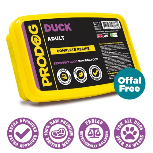 Seriously good nutrition in every bite. Our Duck Complete raw dog food recipe is made with premium, higher-welfare duck and ground duck bone, sourced from British Farm Assurance certified farms. This canine nutritionist formulated meal is supercharged with seasonal vegetables, powerful superfoods, and premium Atlantic salmon oil. Designed with working dogs in mind, our Complete meals deliver real food with real benefits; no fillers, no nasties, just full-on natural flavour and function.