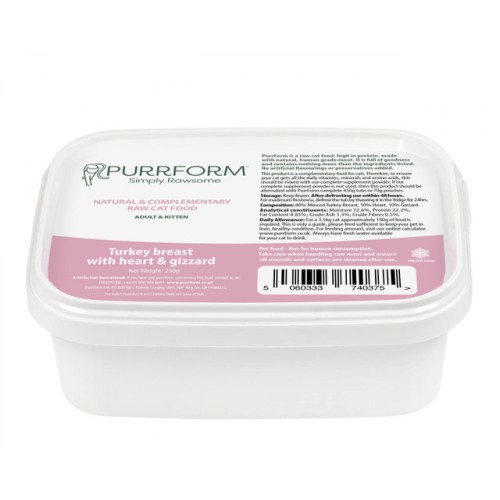 Purrform Turkey Breast with Heart and Gizzard is a complementary natural raw cat food, that contains nothing more than the ingredients listed.