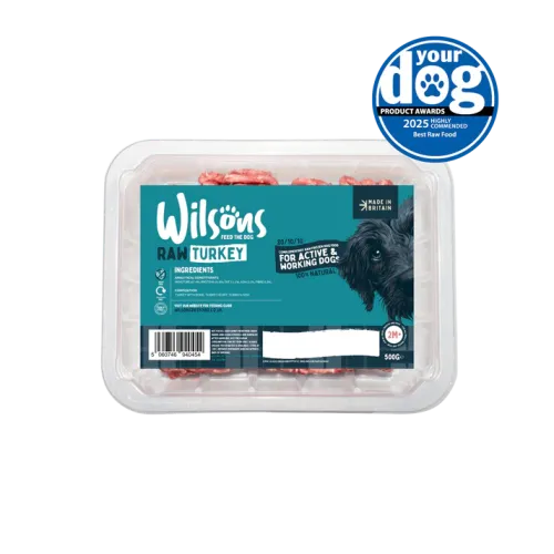Gobble-worthy dinner times, made by Wilsons. Our 100% natural and delicious 80|10|10 turkey complementary frozen dog food contains a nutritionally balanced 80/10/10 mix of turkey, bones and offal - perfect for tailoring mealtimes for your dog to create a balanced diet.